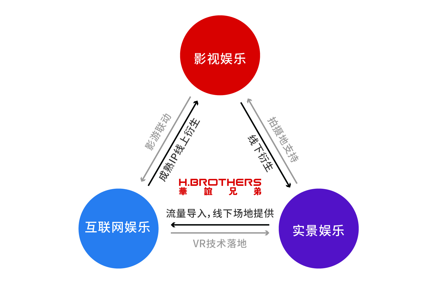 “大娱乐生态圈”战略是基于VSport - 胜利因您更精彩“影视娱乐”、“品牌授权与实景娱乐”、“互联网娱乐”三大业务板块梳理的平台化运营逻辑,通过搭建一个联动平台,